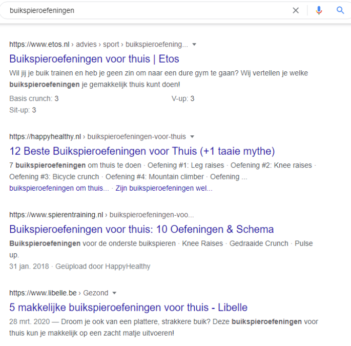 Het hoofdonderwerp is ”Buikspieren trainen”, waar 4000x per maand op wordt gezocht.