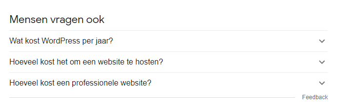 Google geeft hiermee aan welke mensen vragen hebben rondom een zoekwoord. Dit zijn handige gegevens om te noteren.