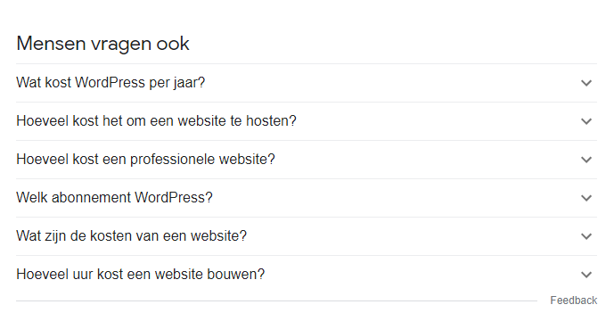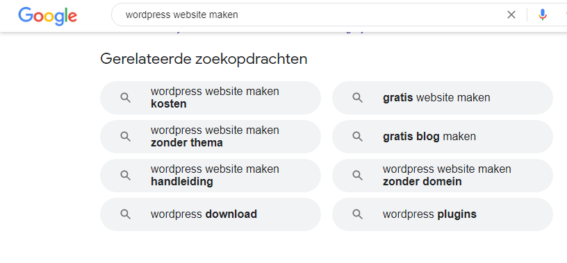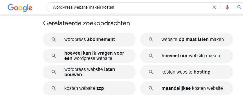 Voor mij is bijvoorbeeld ‘WordPress website maken kosten’ interessant. Door daar op te klikken en ook daar weer naar beneden te scrollen vind je weer nieuwe gerelateerde zoekopdrachten.