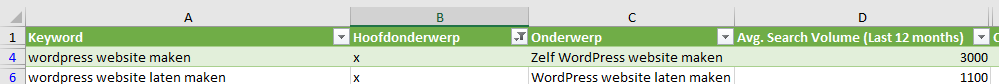 Door in kolom B vervolgens te filteren op ”x” zie je alleen de zoekwoorden die zelf het hoofdonderwerp zijn.
