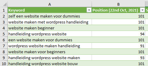Als ik die filter weghaal en in kolom C bijvoorbeeld filter op ”Zelf WordPress website maken”, dan zie ik alle zoekwoorden die bij dat onderwerp horen.