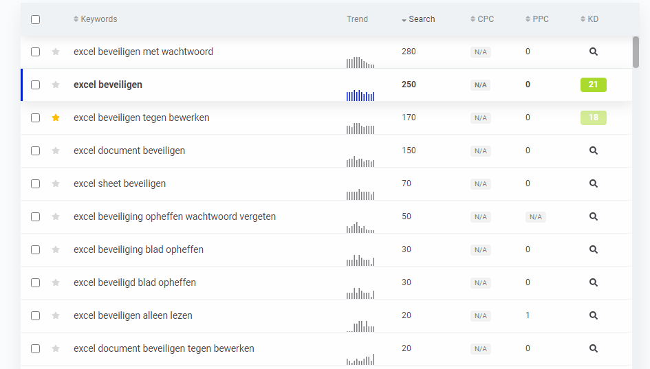Er wordt bijvoorbeeld maar 20x per maand gezocht op ”Excel beveiligen alleen lezen” en 250x op ”Excel beveiligen”.