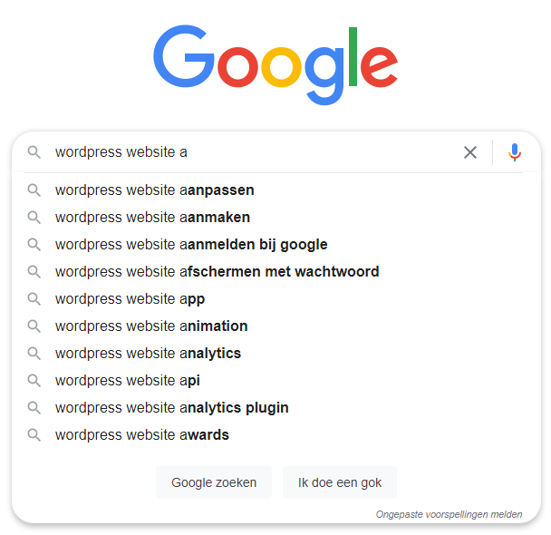 Google doet vervolgens suggesties voor een zoekopdracht. Dit zijn allemaal zoekwoorden waar mensen daadwerkelijk op hebben gezocht, anders zou Google het niet voorstellen.
